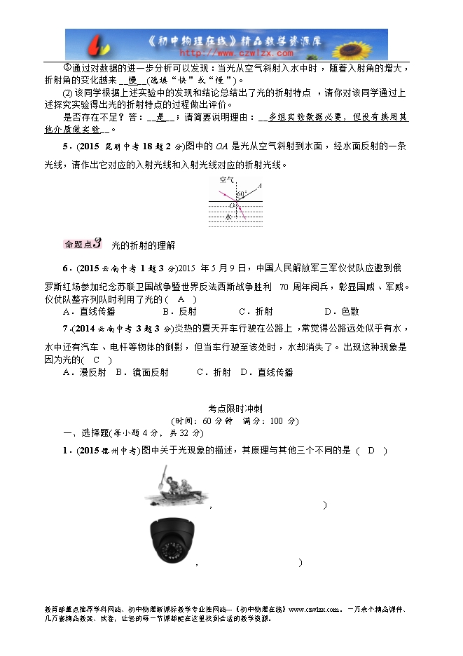 2016年中考复习基础分类集训+考点限时集训:3光的折射 光的色散(云南)