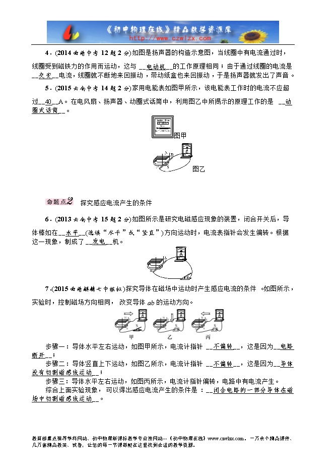 5.(2015云南中考14题2分)家用电能表如图甲所示,该电能表工作时的电流不应超过__40__A。在电风扇、扬声器、动圈式话筒中,利用图乙中所揭示的原理工作的是__动圈式话筒__。