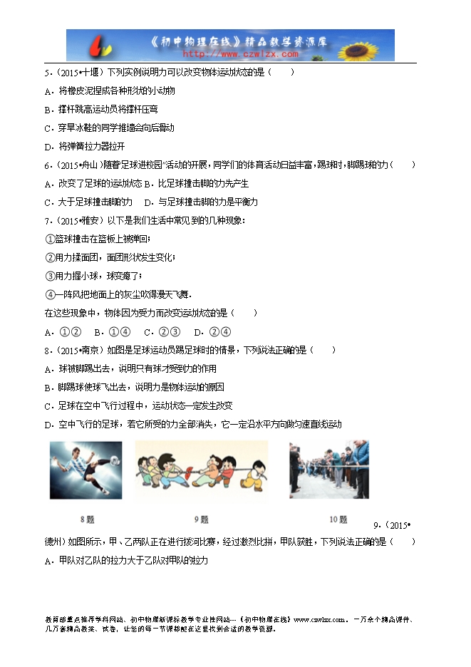 【内容简介】一.选择题 1.(2015?益阳)下列有关力的说法中,正确的是(  ) A.力的作用效果与力的大小、方向和作用点都有关系 B.手拍桌子时,手对桌子施加了力,桌子对手没有施加力 C.弹簧被拉伸时产生的力是弹力,钢丝绳悬挂重物的力不是弹力 D.重力的方向总是垂直向下 2.(2015?温州)如图所示为一种常用核桃夹,用大小相同的力垂直作用在B点比A点更易夹碎核桃,这说明力的作用效果与(  ) A.力的大小有关 B.力的方向有关 C.力的作用点有关 D.受力面积有关 3.(2015?来宾)如图所示,某运动员进行射箭比赛的情形,下面说法正确的是(  ) A.拉弯的弓具有弹性势能 B.手把弓拉弯,说明力可以改变物体的运动状态 C.箭离开弓后能继缕向前运动,是因为箭具有惯性 D.在空中飞行的箭,若所受的力全部消失,它将落向地面 4.(2015?抚顺)中国乒乓球超级联赛于2015年5月26日盛大开幕,如图是女子双打比赛的情景.以下与此有关的说法中正确的是(  ) A.球拍击打乒乓球,使其向前运动是力改变了物体的运动状态 B.乒乓球落到球台反弹后上升的过程,重力势能转化为弹性势能 C.乒乓球上升到最高点时,若受到的力全部消失,它将会下落 D.比赛中运动员脚向左蹬地时,她会向右移动,利用了力的作用时相互的 ......... ?