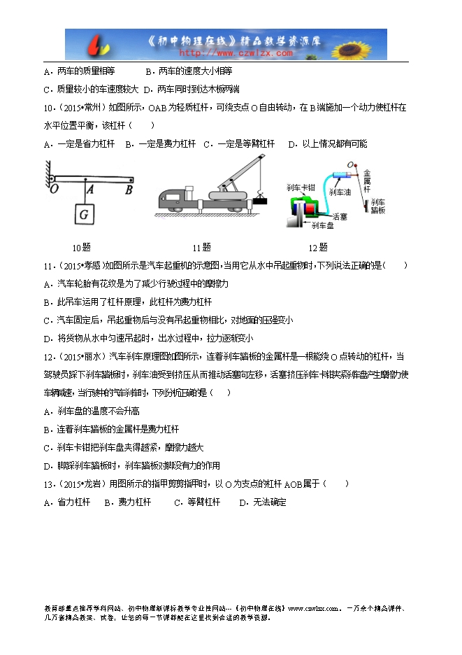 7.(2015?漳州)如图所示,可绕O点转动的轻质杠杆,在D点挂一个重为G的物体M,用一把弹簧测力计依次在A,B,C三点沿圆O相切的方向用力拉,都使杠杆在水平位置平衡,读出三次的示数分别为F1、F2、F3,它们的大小关系是( )
