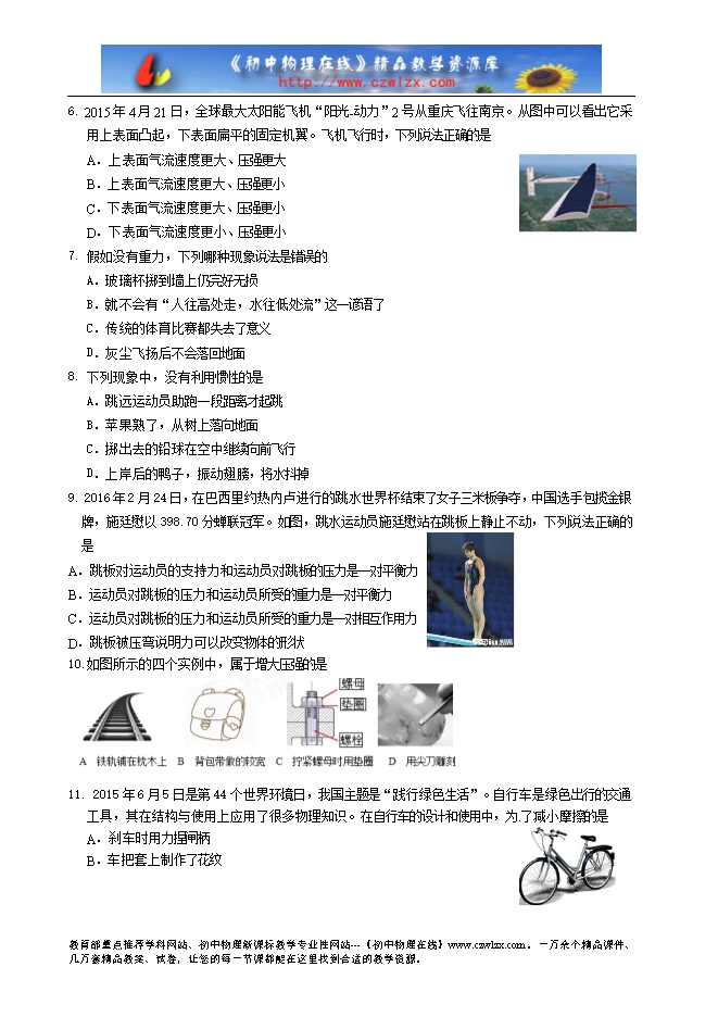 6. 2015年4月21日,全球最大太阳能飞机“阳光-动力”2号从重庆飞往南京。从图中可以看出它采用上表面凸起,下表面扁平的固定机翼。飞机飞行时,下列说法正确的是