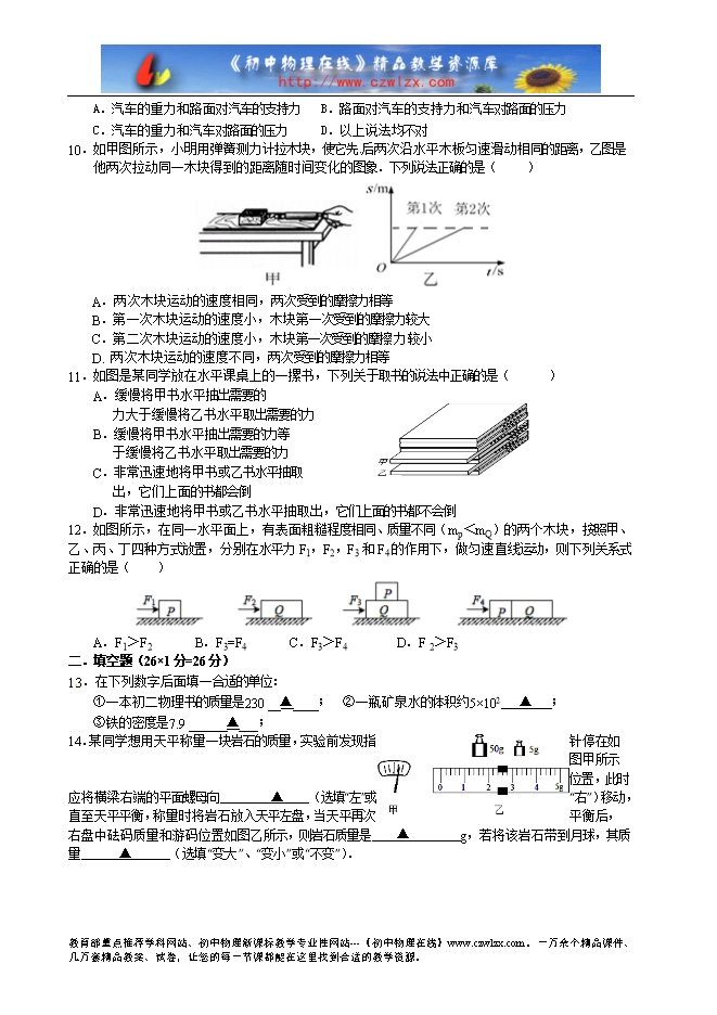10.如甲图所示,小明用弹簧测力计拉木块,使它先 后两次沿水平木板匀速滑动相同的距离,乙图是他两次拉动同一木块得到的距离随时间变化的图象.下列说法正确的是( )