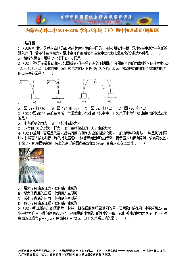 内蒙古赤峰二中2014-2015学年八年级(下)期中物理试卷(解析版)