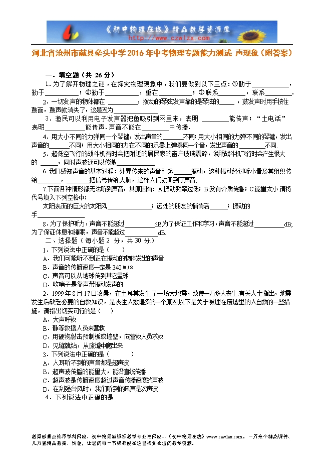 河北省沧州市献县垒头中学2016年中考物理专题能力测试:声现象(附答案)