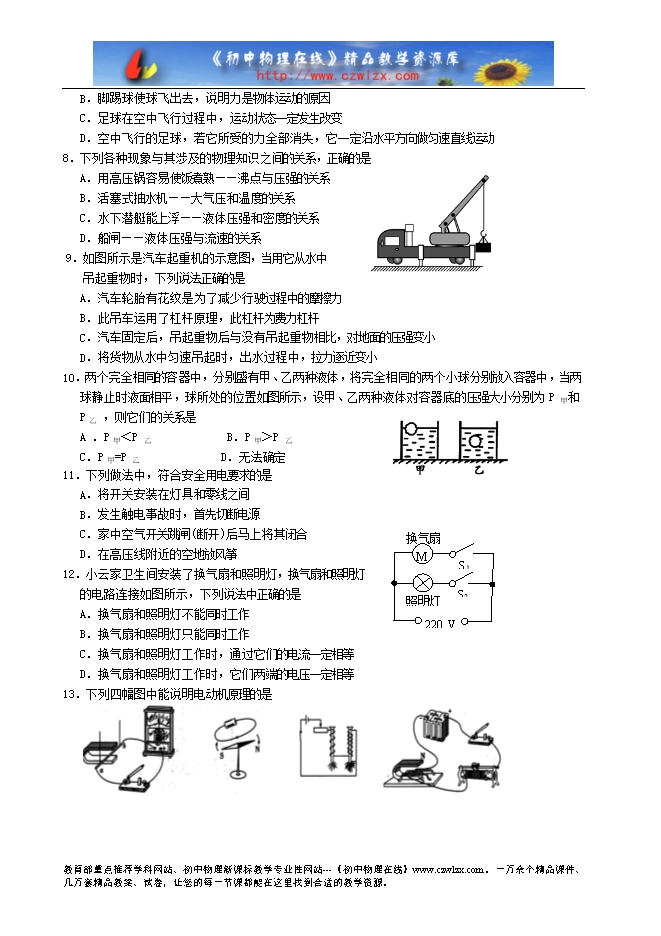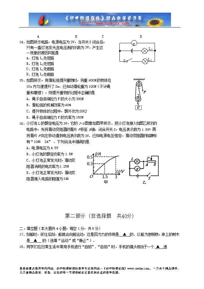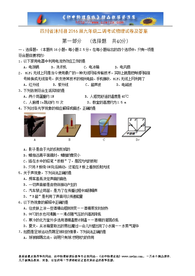 四川省沐川县2016届九年级二调考试物理试卷及答案