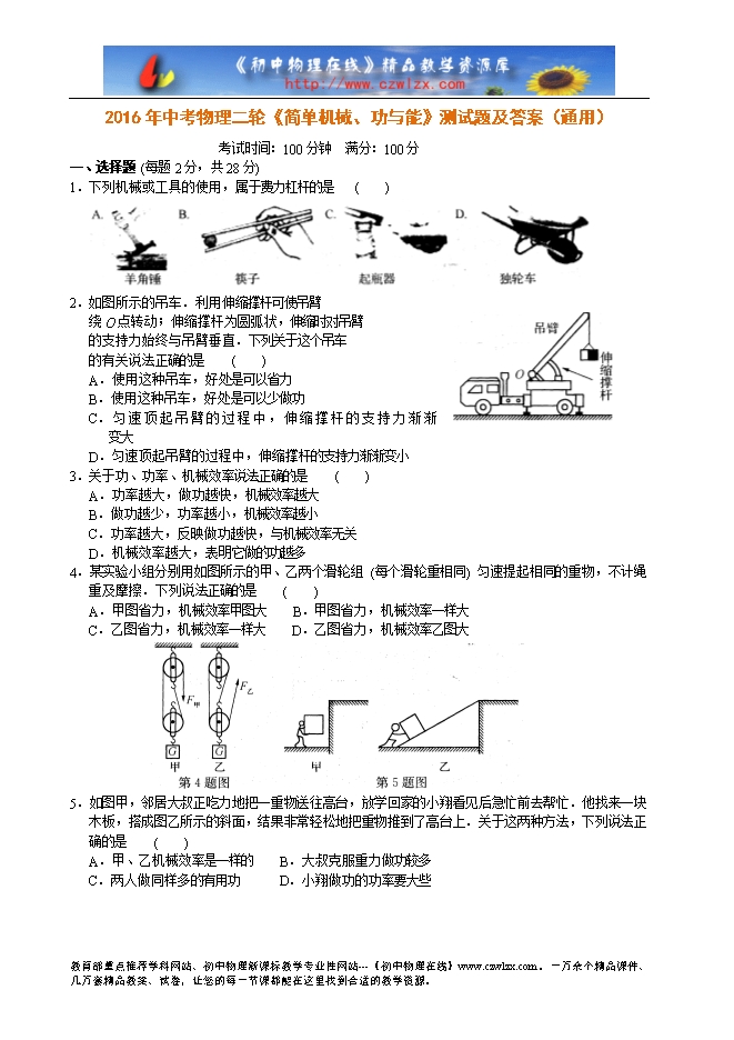 2016年中考物理二轮《简单机械、功与能》测试题及答案(通用)