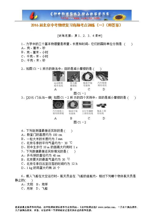 3.[2015?门头沟一模] 如图C1-2所 示的四个实例中,目的是减小摩擦的是( )