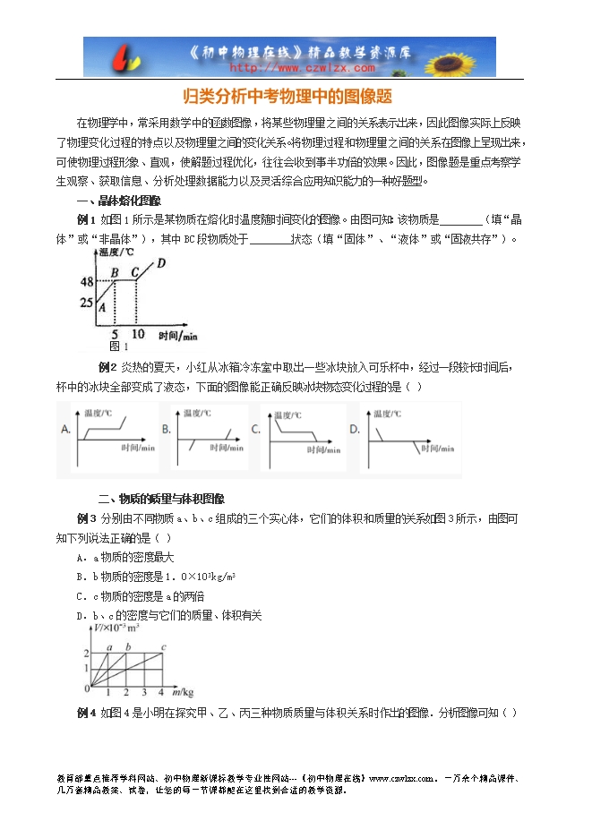 【内容简介】在物理学中,常采用数学中的函数图像,将某些物理量之间的关系表示出来,因此图像实际上反映了物理变化过程的特点以及物理量之间的变化关系。将物理过程和物理量之间的关系在图像上呈现出来,可使物理过程形象、直观,使解题过程优化,往往会收到事半功倍的效果。因此,图像题是重点考察学生观察、获取信息、分析处理数据能力以及灵活综合应用知识能力的一种好题型。