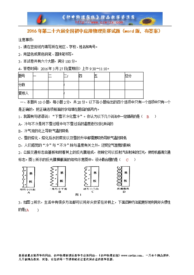 2016年第二十六届全国初中应用物理竞赛试题(word版,有答案)
