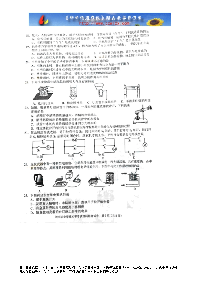 2016年湖南省长沙市中考物理试题(图片版,无答案)