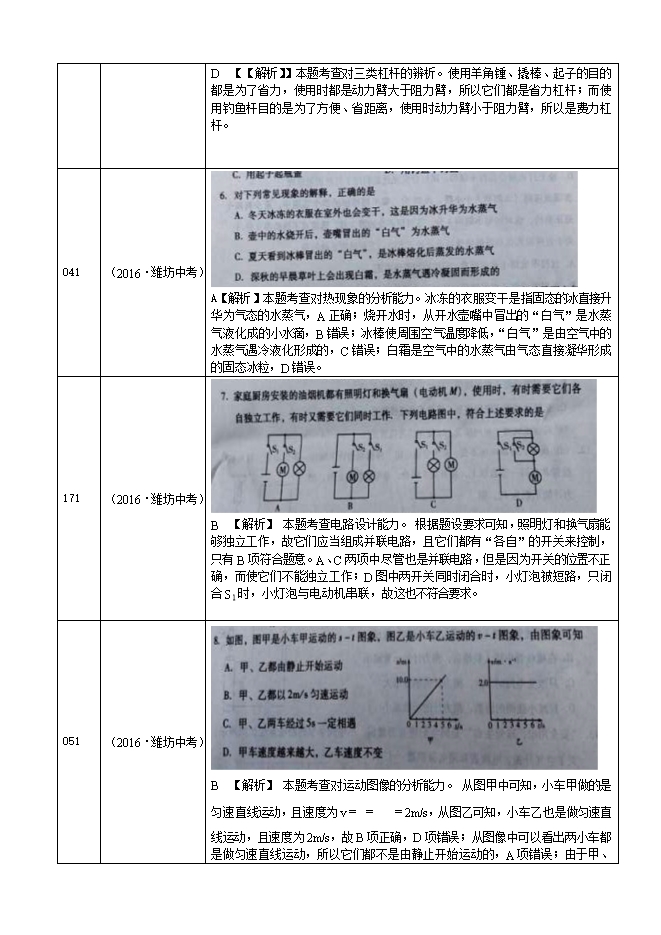 2016年山东省潍坊市初中物理学业水平考试试题分类解析表