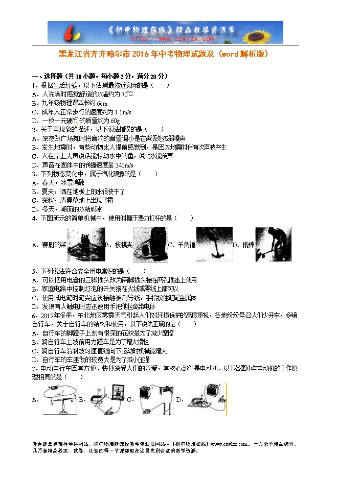 黑龙江省齐齐哈尔市2016年中考物理试题(word解析版)