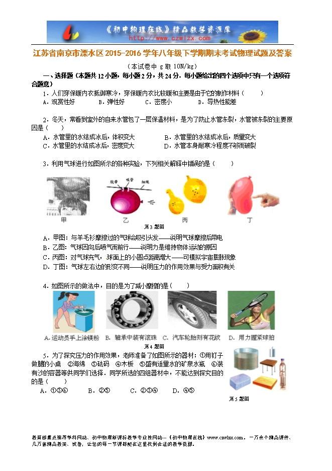 江苏省南京市溧水区2015-2016学年八年级下学期期末考试物理试题及答案