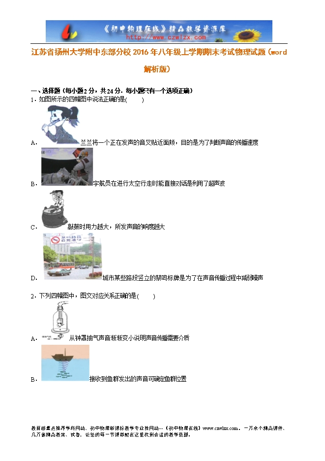 江苏省扬州大学附中东部分校2016年八年级上学期期末考试物理试题(word解析版)