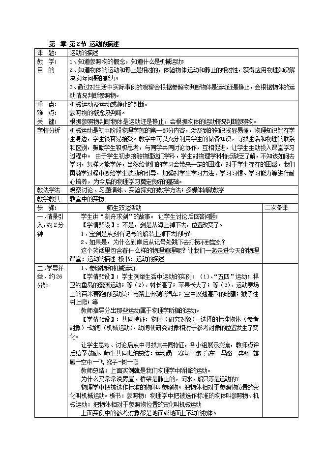 2016年人教版物理八年级上册(新)第一章 第2节 运动的描述 教案