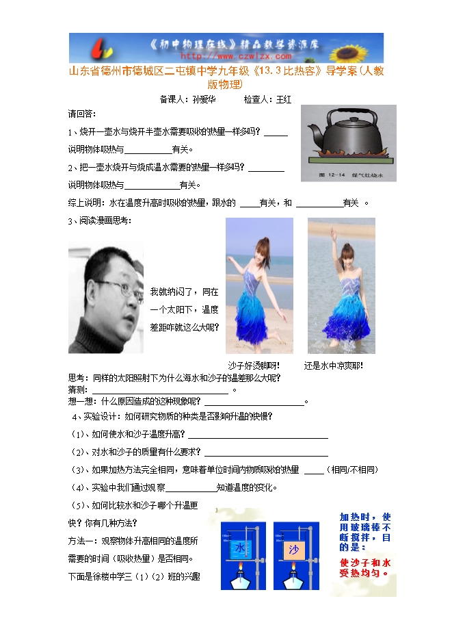 山东省德州市德城区二屯镇中学九年级《13.3比热容》导学案(人教版物理)