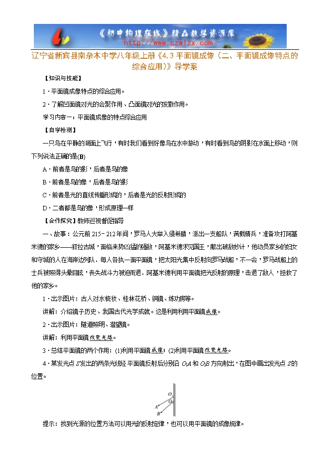 辽宁省新宾县南杂木中学八年级上册《4.3平面镜成像(二、平面镜成像特点的综合应用)》导学案