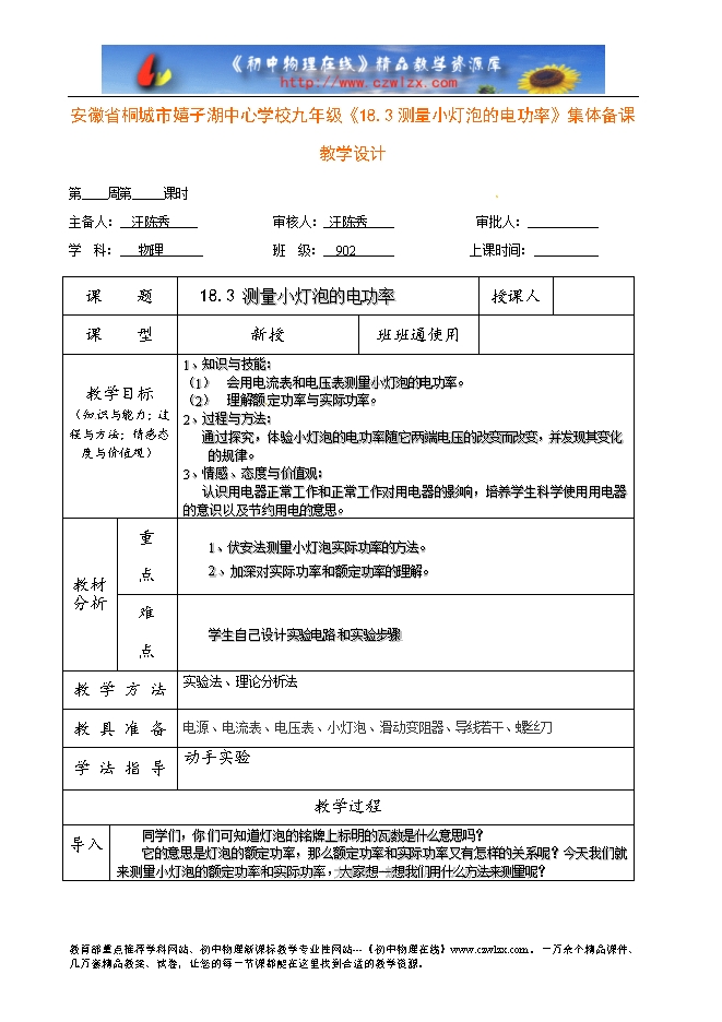 安徽省桐城市嬉子湖中心学校九年级《18.3测量小灯泡的电功率》集体备课教学设计