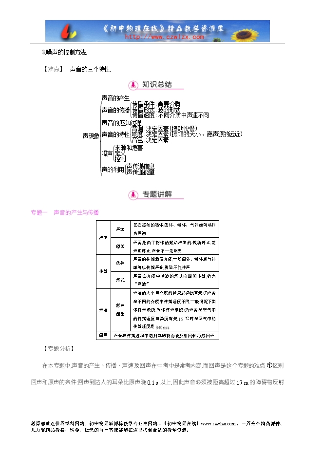 【内容简介】1.复习声音的产生、传播、声音的特性、噪声以及声的利用等基础知识. 2.使学生通过复习理解声音产生的条件、传播的条件、控制噪声的方法以及声音在实际生活中的利用等知识. 3.会利用声速及运动的相关知识解答简单的回声计算问题. 4.熟悉中考在这部分的题型,热点考点的考查形式. 1.通过复习和归纳,学会梳理知识的方法. 2.通过复习活动,进一步了解研究物理问题的方法. 通过对本单元知识的系统复习,培养热爱科学、立志将所学知识应用到实践中去的品质. 【重点】 1.声音的产生及传播条件. 2.声音的三个特性. 3.噪声的控制方法. 【难点】 声音的三个特性. 声现象 专题一 声音的产生与传播 产生 声源 正在振动的物体.固体、液体、气体都可以作为声源 原因 声音是由于物体的振动产生的.振动停止,发声也停止,声音不一定消失 传播 条件 声音的传播需要介质,一切固体、液体和气体都可以传播声音,真空不能传声 形式 声音在介质中以波的形式向四周传播,称为“声波” 声速 影响 因素 声速的大小与介质的种类及温度有关.①声音在不同的介质中传播速度不同,一般情况下,固体传声最快,气体传声最慢;②声音在空气中的传播速度与温度有关,15 ℃时在空气中的传播速度是340 m/s 回声 声音在传播过程中遇到障碍物而被反射回来,形成回声   【专题分析】 在本专题中,声音的产生、传播、声速及回声在中考中是常考内容,而回声是这个专题的难点.①区别回声和原声的条件:回声到达人的耳朵比原声晚0.1 s以上.因此声音必须被距离超过17 m的障碍物反射回来,人才能听到回声,低于0.1 s时,反射回来的声音只能使原声增强;②回声测距:如测海深或发声体离障碍物有多远,测量原理:s=v声 .  关于声音的说法正确的是 (  ) A.声音是由物体振动产生的,振动停止,声音也就消失 B.声音只能通过介质传播 C.声音在一切介质中的传播速度都是相同的 D.声音中,人们听不见的声音只有超声波 解析:声音是由物体的振动产生的,振动停止,发声停止,但声音不一定消失,故选项A错误;声音的传播需要介质,真空是不能传声的,故选项B正确;声音的传播速度和介质的种类与介质的温度有关,即使是同一种传播介质,温度不同,声音的传播速度也不同,故选项C错误;超声波和次声波都超出了人耳的听觉范围,人们都听不到,故选项D错误.故选B. ......... 下载word文档附件