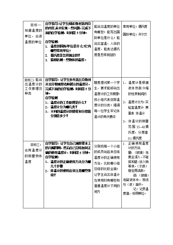 【内容简介】目标确定的依据 1. 课程标准相关要求 学会正确使用温度计 2. 教材分析 本节课是本章的一个重点,首先要让学生正确认识了温度,才能会使用温度计。为以后的内容打下一个良好的基础,所以本节内容非常重要。 3. 中招考点分析 在中招考试中对温度计的使用考察的比较多。 4. 学情分析 九年级的学生已具有了一定的物理知识,能力也得到一定的发展。虽然学生已经学习了一年的物理知识,但大多数学生思维还是以形象思维为主,感性认识比较匮乏。因此,教学中仍需以一些感性认识作为依托,借助实验等手段加强直观性和形象性,把抽象的概念具体化、生活化,从学生的体验、经历和身边的事物来建立和强化内能的概念,让学生逐步认识到温度的概念,学会正确使用温度计。 学习目标 1.知道温度的单位,会读温度的单位 2. 能说出温度计的工作原理及种类 3. 会用温度计的测量物体温度 评价任务 1. 让学生通过对温度概念的理解,能够说出温度的一些常用单位及其换算关系 2. 学生通过对温度计的认识,能够自己正确使用温度计 3. 学生能够正确指出温度计的结构并能说出温度计的工作原理 教学过程 教学环节 教学活动 评价要点 两类结构或要点归纳 创设情境引入新课 通过对本天温度的估测,引入温度这一概念,进而引入新课 目标一:知道温度的单位,会读温度的单位 自学指导:让学生阅读教材第四页的内容,从中发现一些问题,完成下面的自学检测,时间是5分钟。 自学检测: 1. 温度的国际单位是什么?它有哪些常用单位? 2. 摄氏度是怎样规定的? 3. 能够估测一些物体的温度。 能说出温度的单位有哪些;能写出国际单位是什么;能说出室温,人体的温度,能表达摄氏度是怎样规定的 常用单位:摄氏度 国际单位:开尔文 目标二:能说出温度计的工作原理及种类 自学指导:让学生参考第五页教材并且仔细观察老师展示的温度计,完成下面的自学检测,时间是5分钟。 自学检测 1. 温度计的工作原理是什么? 2. 温度计分为哪几类? 3. 不同的温度计的量程和分度值分别是多少? 随意提问某一个学生,要求能够说出温度计的工作原理;找小组代表回答温度计的分类;强调每一位学生牢记体温计的有关要点 1. 温度计是根据液体热胀冷缩的性质制成的 2. 温度计分为:实验室温度计 寒暑表 体温计 3. 体温计的测量范围35--42摄氏度,分度值0.1摄氏度 ......... ?