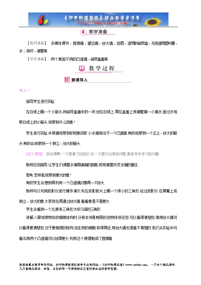 【教师准备】 多媒体课件、显微镜、望远镜、放大镜、挂图、透明的磁带盒、无色透明塑料膜、水、烧杯、滴管等.