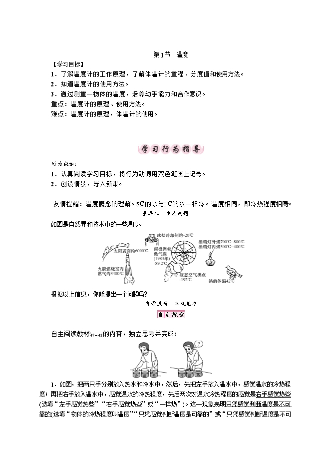 1.如图,把两只手分别放入热水和冷水中,然后,先把左手放入温水中,感觉温水的冷热程度;再把右手放入温水中,感觉温水的冷热程度,先后两次对温水冷热程度的感觉是右手感觉热些(选填“左手感觉热些”“右手感觉热些”或“一样热”)。这一现象表明只凭感觉判断温度是不可靠的(选填“物体的冷热程度叫温度”“只凭感觉判断温度是可靠的”或“只凭感觉判断温度是不可靠的”)。