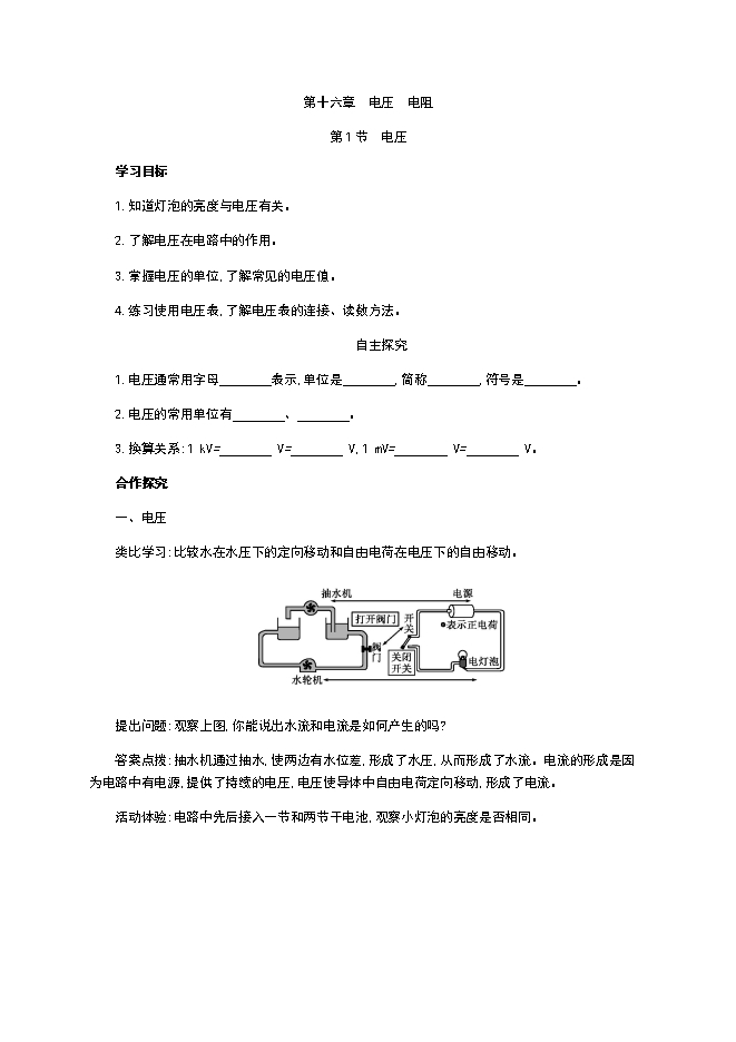 人教版九年级物理全册精品教学案:第十六章电压 电阻第1节 电压(答案含解析)