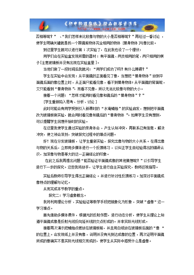 情感、态度与价值观:在探究“平面镜成像特点”中领略物理现象的美妙与和谐,获得“发现”成功的喜悦。培养实事求是的科学态度和作风。通过对平面镜、凸面镜和凹面镜成像的应用的了解,初步认识科学技术对人类生活的影响。