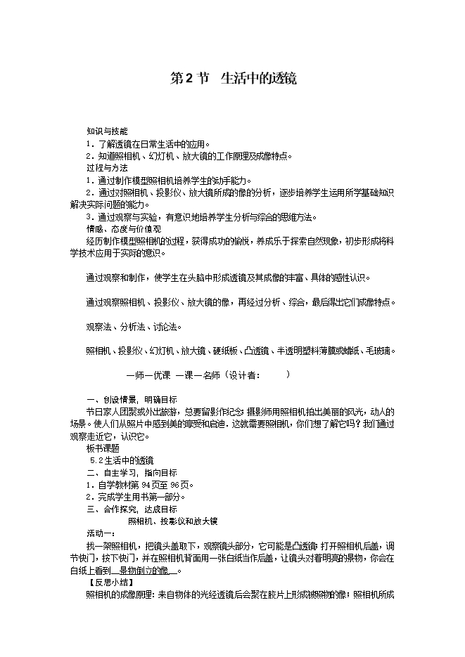 2016秋人教版八年级物理上册教案:5.2生活中的透镜