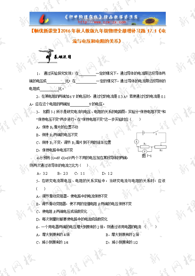 【畅优新课堂】2016年秋人教版九年级物理全册增补习题:17.1《电流与电压和电阻的关系》
