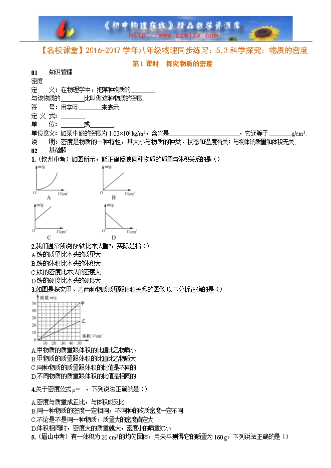 【名校课堂】2016-2017学年八年级物理同步练习:5.3科学探究:物质的密度
