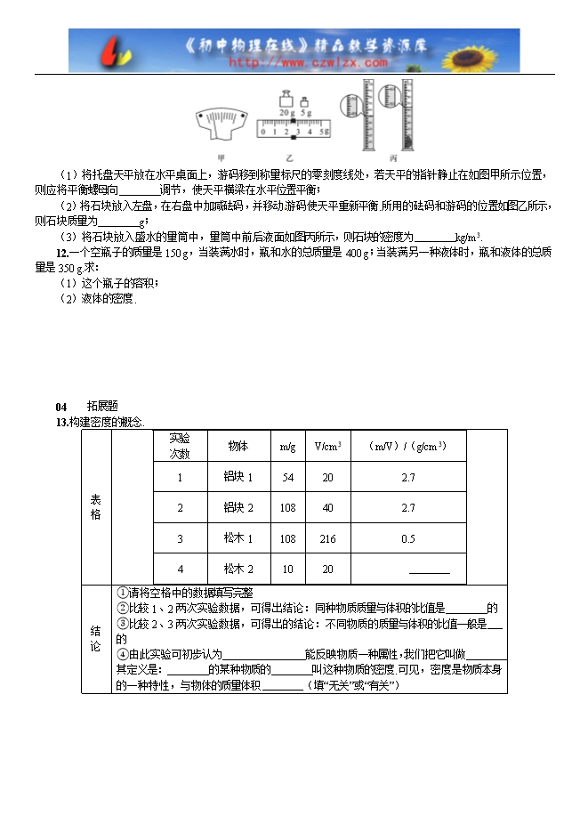 - 6412020-2021学年苏科版八年级物理下册课课练:6.3物质的密度(附答案)
