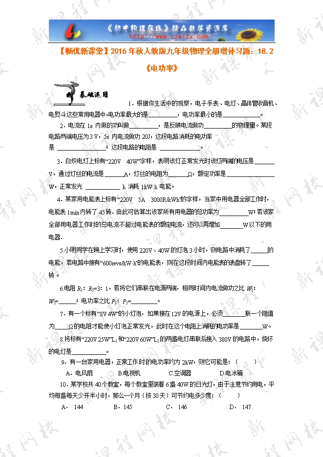 【畅优新课堂】2016年秋人教版九年级物理全册增补习题:18.2《电功率》