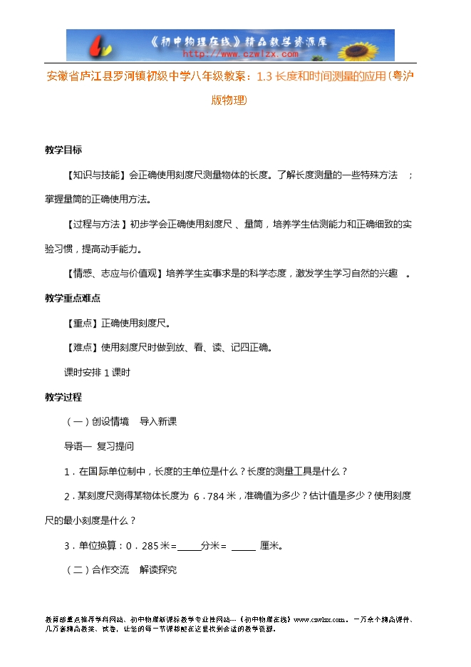 安徽省庐江县罗河镇初级中学八年级教案:1.3长度和时间测量的应用(粤沪版物理)