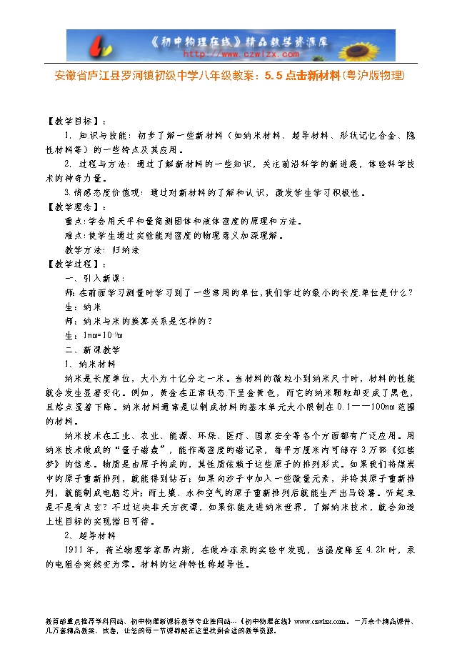 安徽省庐江县罗河镇初级中学八年级教案:5.5点击新材料(粤沪版物理)