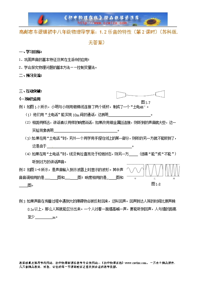 高邮市车逻镇初中八年级物理导学案:1.2乐音的特性(第2课时)(苏科版,无答案)