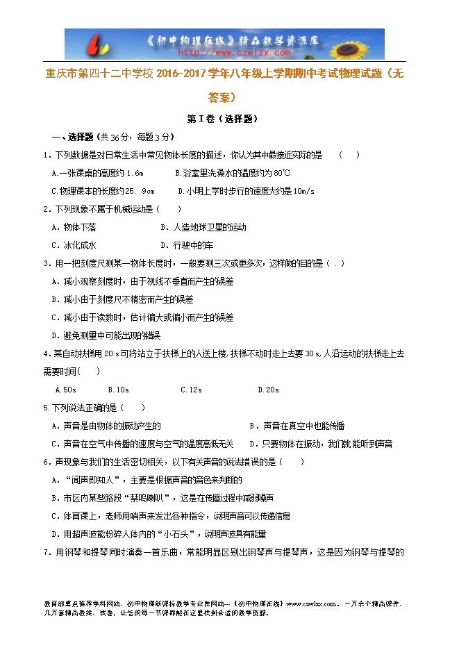 重庆市第四十二中学校2016-2017学年八年级上学期期中考试物理试题(无答案)