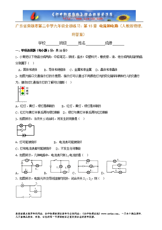 广东省南雄市第二中学九年级全册练习:第15章 电流和电路(人教版物理,附答案)
