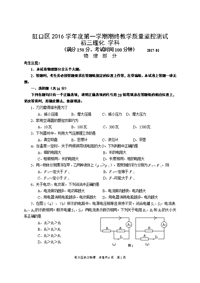 上海市虹口区2017届第一学期九年级质量调研考试物理试题及答案