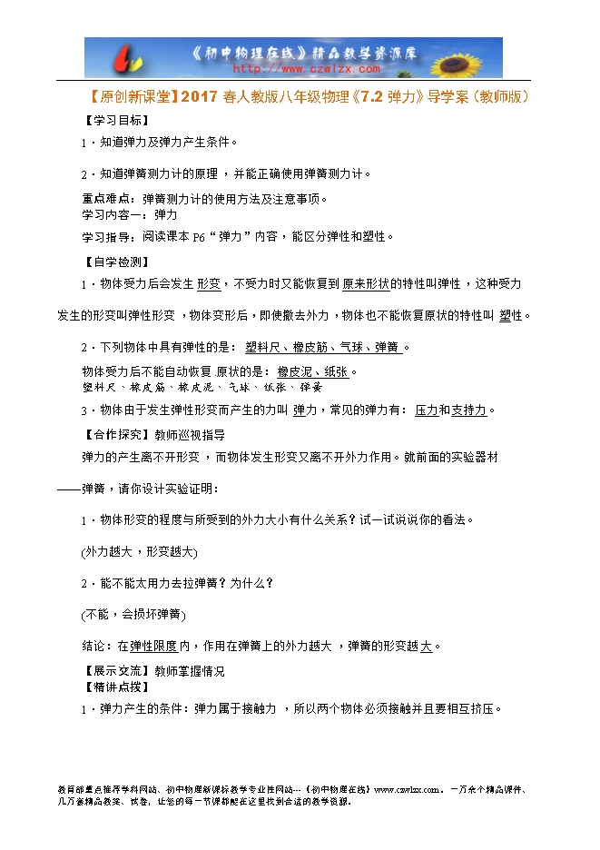 【原创新课堂】2017春人教版八年级物理《7.2弹力》导学案(教师版)