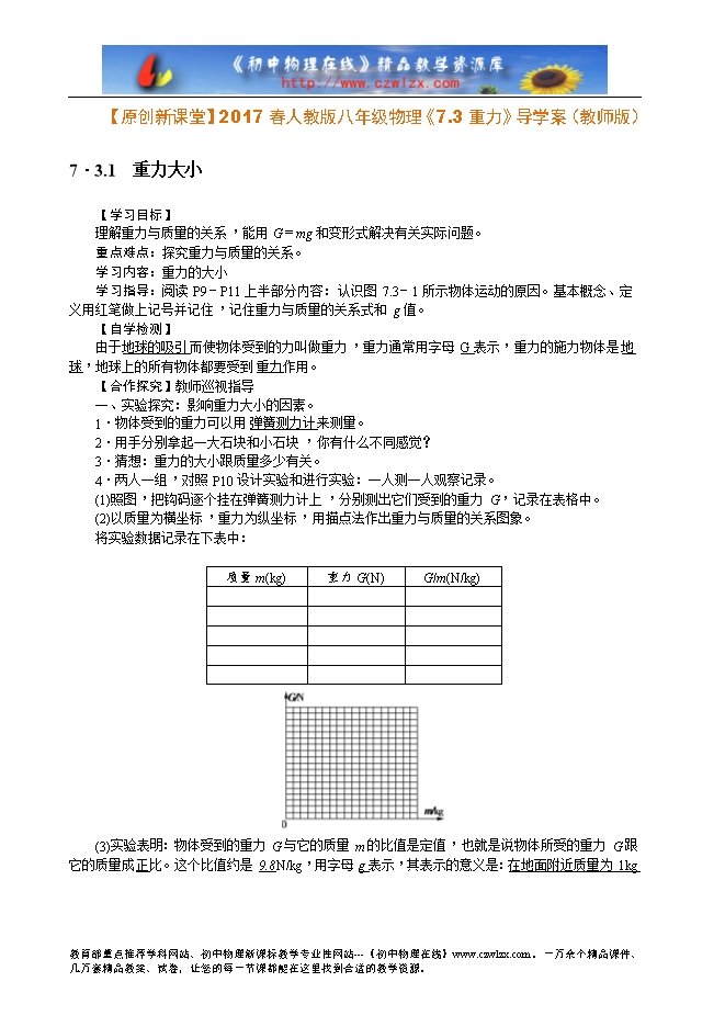 学习指导:阅读P9-P11上半部分内容:认识图7.3-1所示物体运动的原因。基本概念、定义用红笔做上记号并记住,记住重力与质量的关系式和g值。