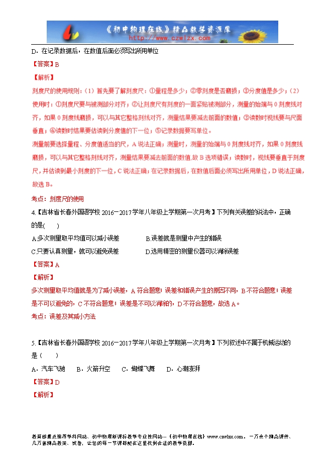 3.【吉林省长春外国语学校2016—2017学年八年级上学期第一次月考】关于刻度尺的使用,以下说法错误的是( )