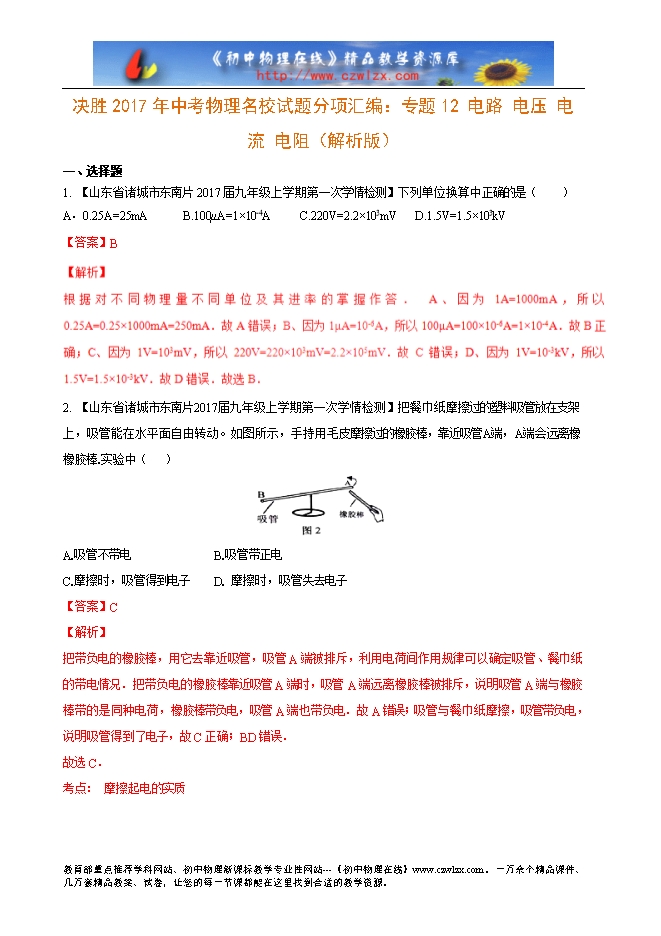 决胜2017年中考物理名校试题分项汇编:专题12 电路 电压 电流 电阻(解析版)