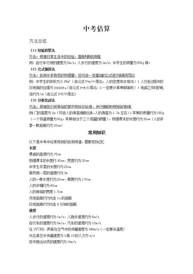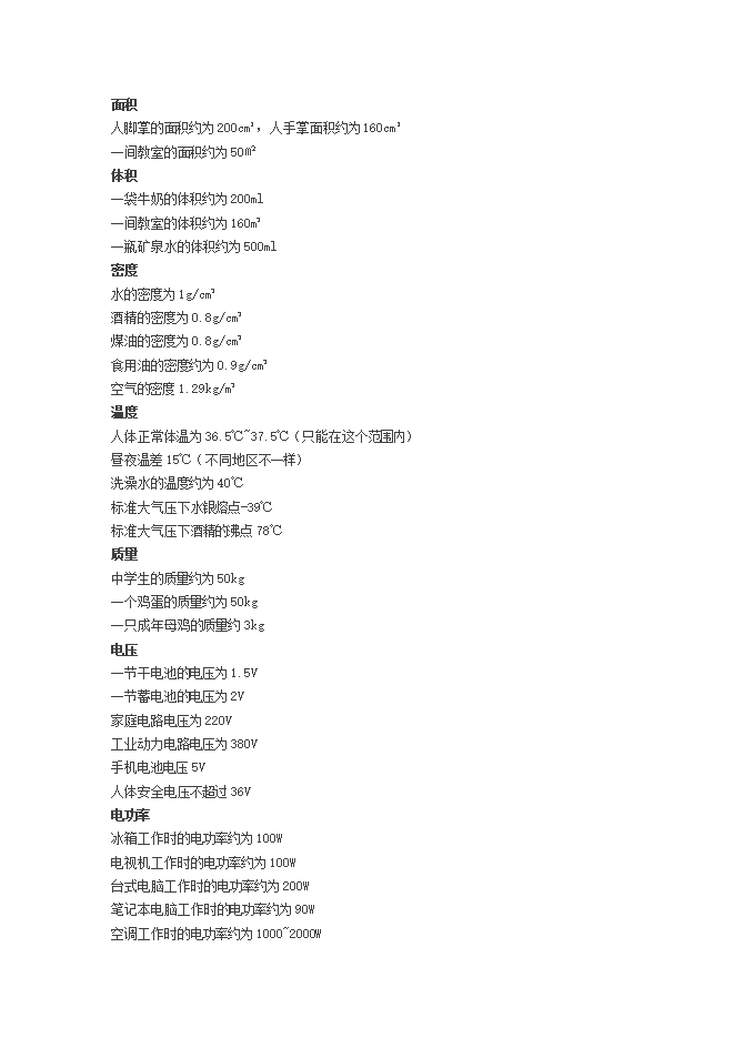 例:中学生的体积为0.05m?;(由公式V=m/ρ得出,人的密度和水相当);人行走过程中的对地面的压强为20000Pa(由公式P=F/S得出,S一定要计算单脚面积);电脑工作时的电流约为1A(由公式I=P/U得出)