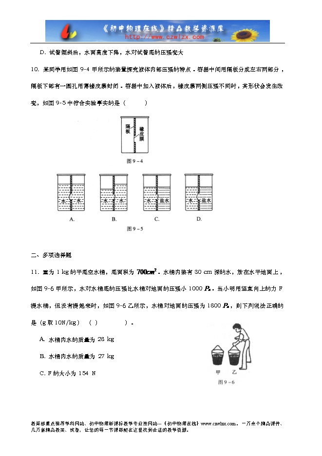 5.如图9-1所示是甲、乙两种液体内部的压强p与深度h关系的图像。设液体甲的密度为
