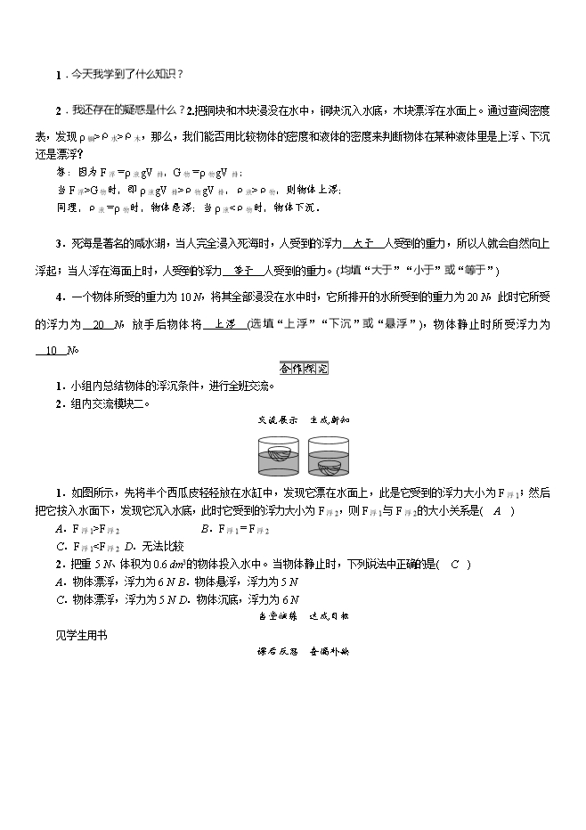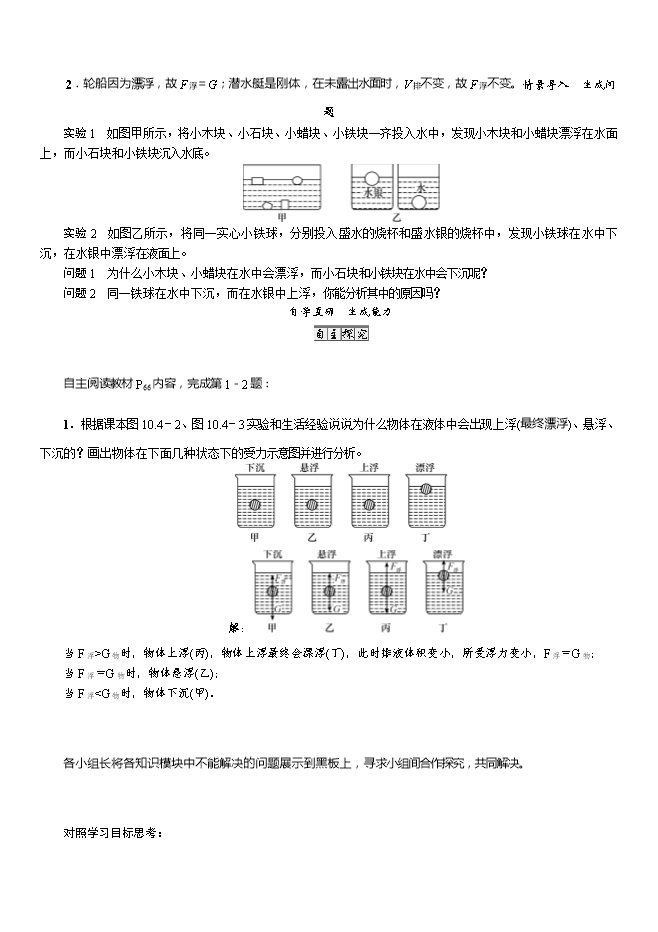 1.知道物体的浮沉现象,能从受力分析的角度判断物体的浮沉状况。