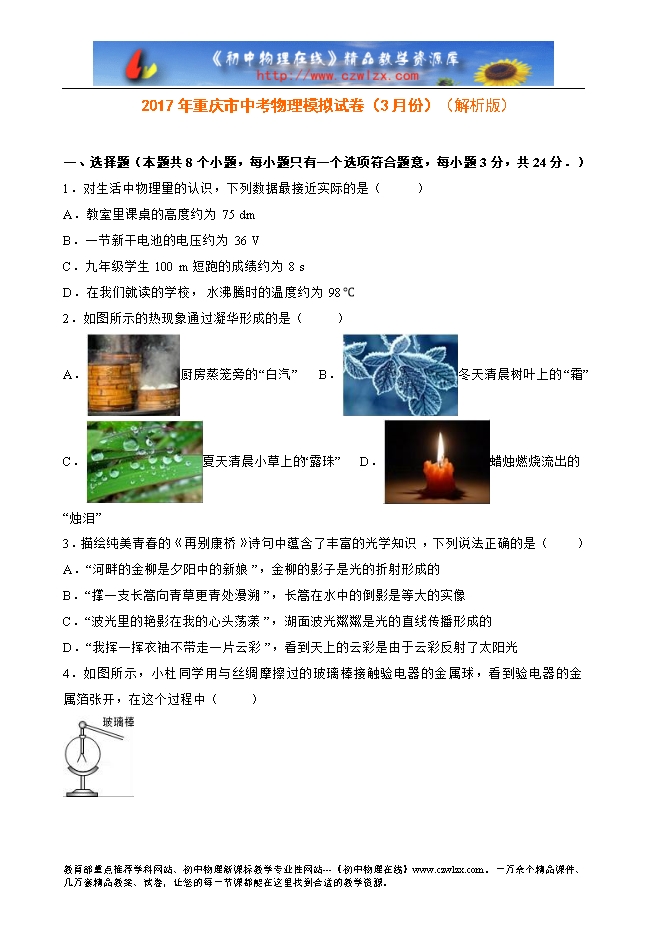 2017年重庆市中考物理模拟试卷(3月份)(解析版)