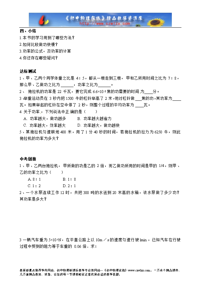 【典中点】2017春沪科版八年级物理下册学案:10.4做功的快慢(方案2)