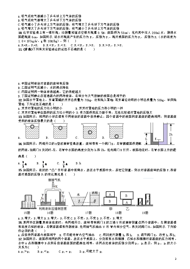 四川省成都市人北中学2017年中考物理(教科版)专题复习训练-《压强》(无答案)