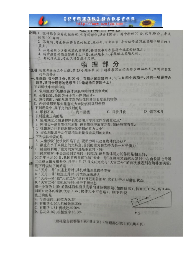 【内容简介】四川省南充市2017年中考物理试题(图片版,无答案)